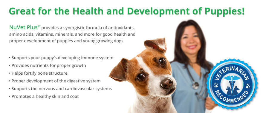 For puppies – Fills the immunity gap all puppies’ experience. Shortly after birth maternal antibody effectiveness is greatly reduced. By 8 weeks your puppies’ immune system is at a vulnerable point. Once in their new home, the immune system is weakened by the stress of adoption and exposure to novel bacteria and viruses in their environment. This is also when the vaccine series is started. Vaccines are most effective if the immune system can respond properly. Starting NuVet Plus now is important to helping your puppies’ grow into a healthy adult.
